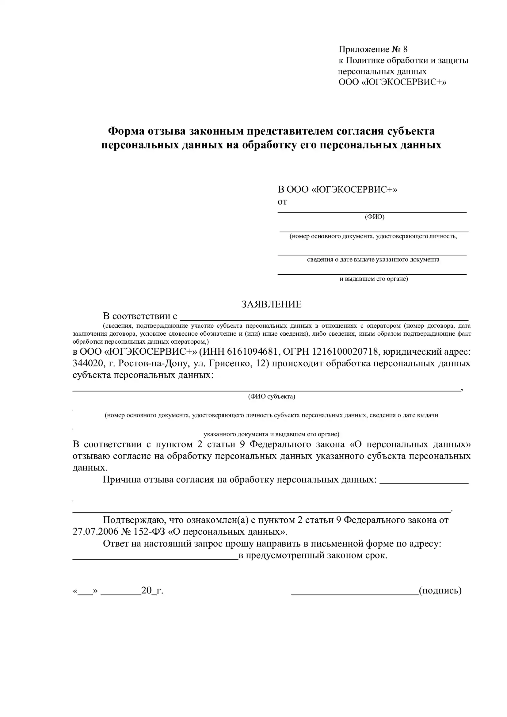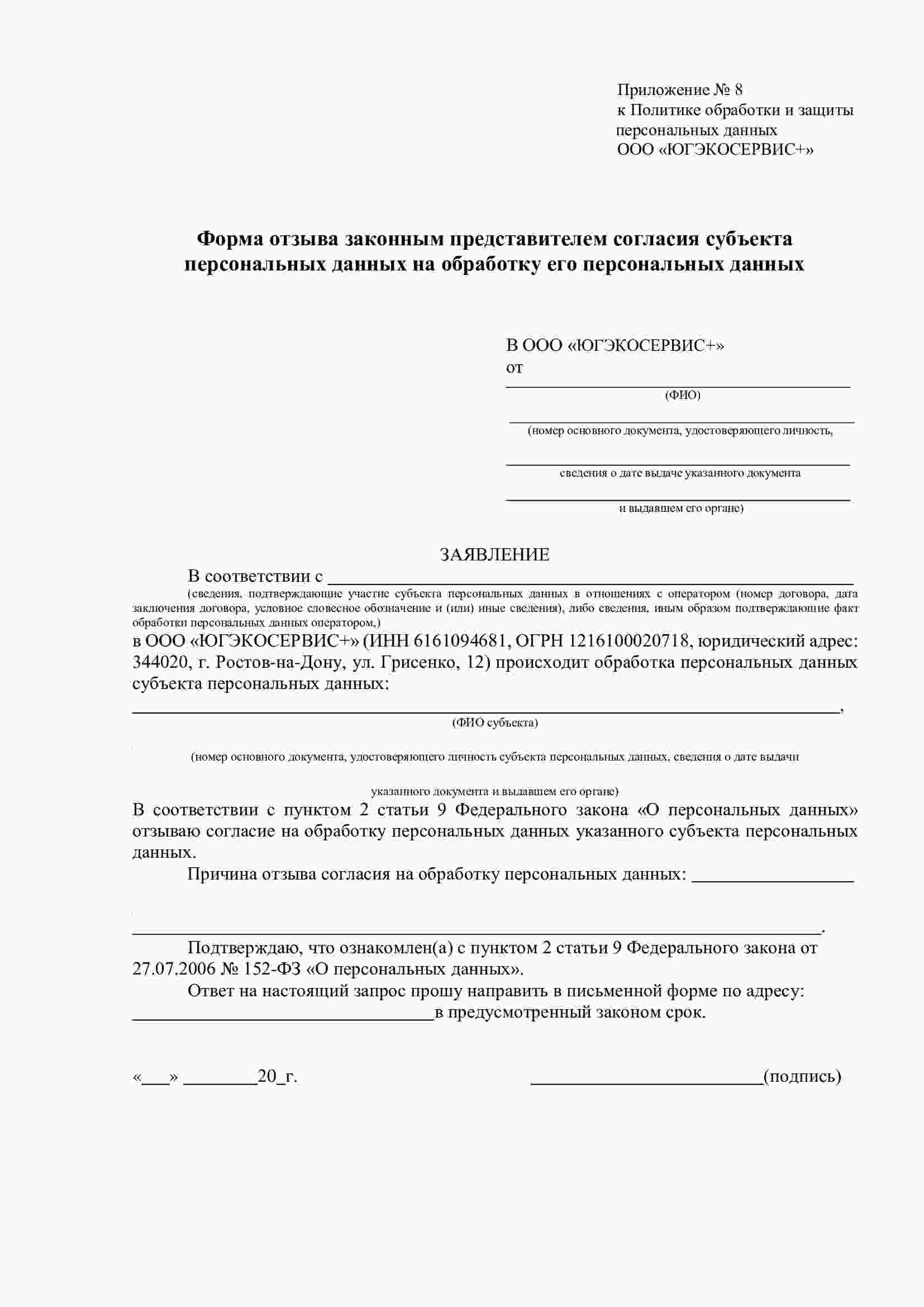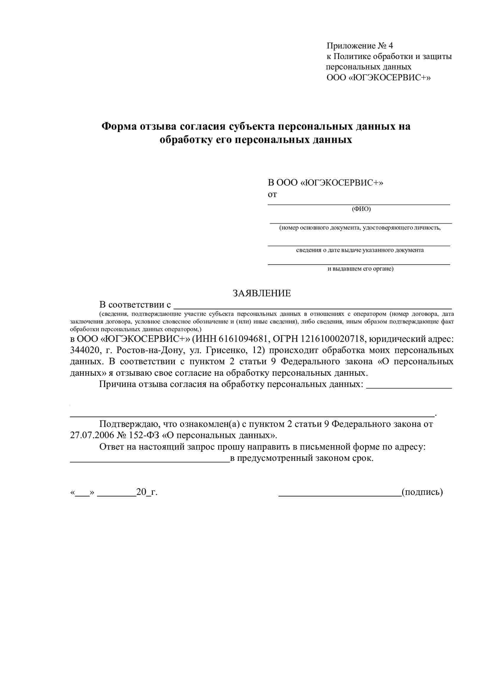 6.11. Для отзыва согласия Субъекта персональных данных на обработку его персональных данных субъекту (либо законному представителю) необходимо заполнить соответствующую форму отзыва согласия субъекта персональных данных на обработку его персональных данных (приложение 4 или 8) и передать лично работникам ООО «ЮГЭКОСЕРВИС+», принимающим обращения граждан, либо по почте. В случае отзыва согласия на обработку персональных данных ООО «ЮГЭКОСЕРВИС+» вправе продолжить обработку персональных данных без согласия субъекта персональных данных при наличии оснований, указанных в пунктах 2 - 11 части 1 статьи 6, части 2 статьи 10 и части 2 статьи 11 Федерального закона от 27.07.2006 № 152-ФЗ «О персональных данных».